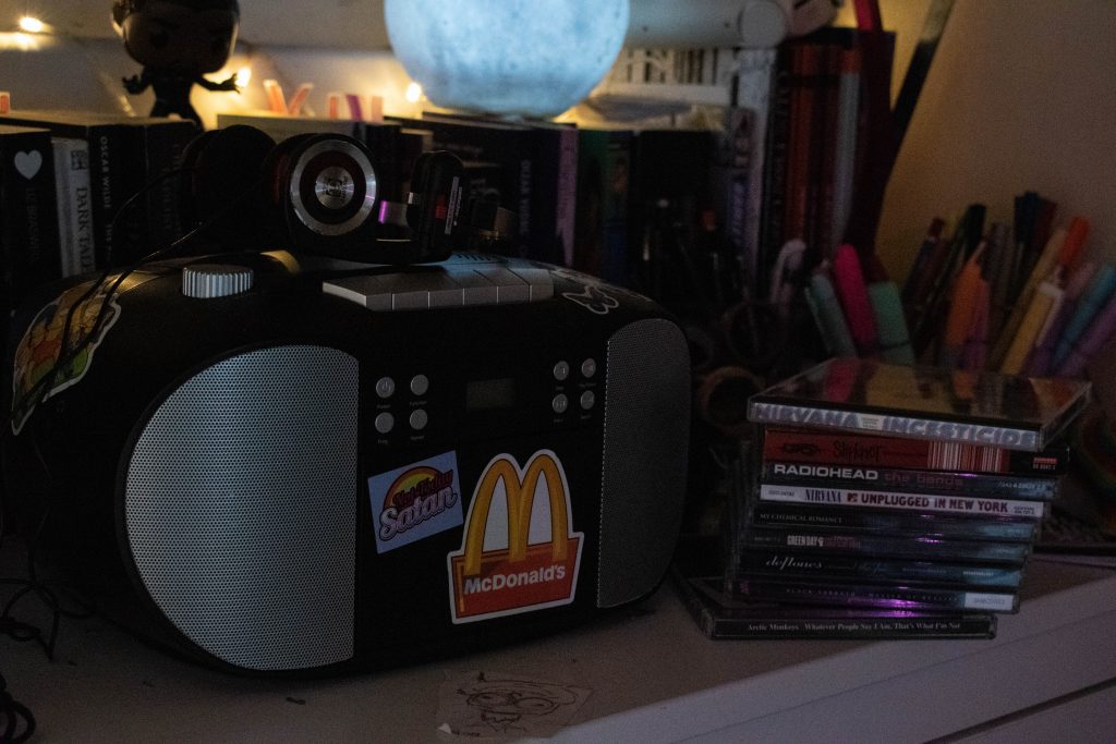 Ivywood isn’t completely separate from the physical world. It shares similarity in objects that I’ve taken from Ivywood, and objects and places that I’ve taken to Ivywood. My backpack is something that I’ve taken from Ivywood and materialised in the physical world. It’s modelled to look the way Miles’ backpack does. My CD collection is a piece of Ivywood that I’ve recreated in the physical world, too, specifically albums released before 1995 – Deftones’ Adrenaline from 1995; Nirvana’s MTV Unplugged in New York from 1994; Black Sabbath’s Master of Reality from 1971. Ivywood exists in the 90s. Cassettes were more popular than CDs at the time, which is why I want to start collecting them as well. Recreating these items in the physical world keeps me connected to Ivywood so that I’m there even when I can’t be.