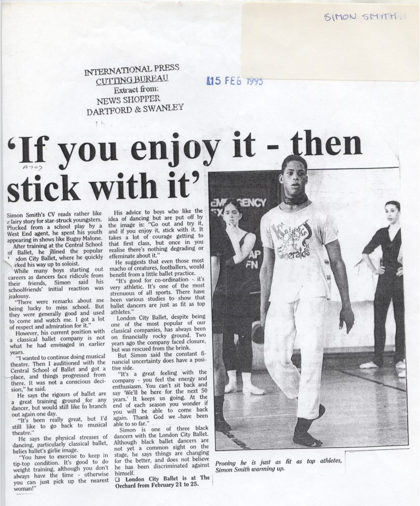 Originally, Simon had little interest in ballet. From 11 to 16, he attended a drama school, where his English teacher encouraged him to audition for a ballet company to perfect his dancing technique. “But then I fell in love with ballet and realised that it was possibly a place for me. I saw a company called Dance Theatre of Harlem, all Black Americans. . . and it transformed my world, seeing a whole group of Black people doing classical ballet, and that’s what propelled me to do it.”