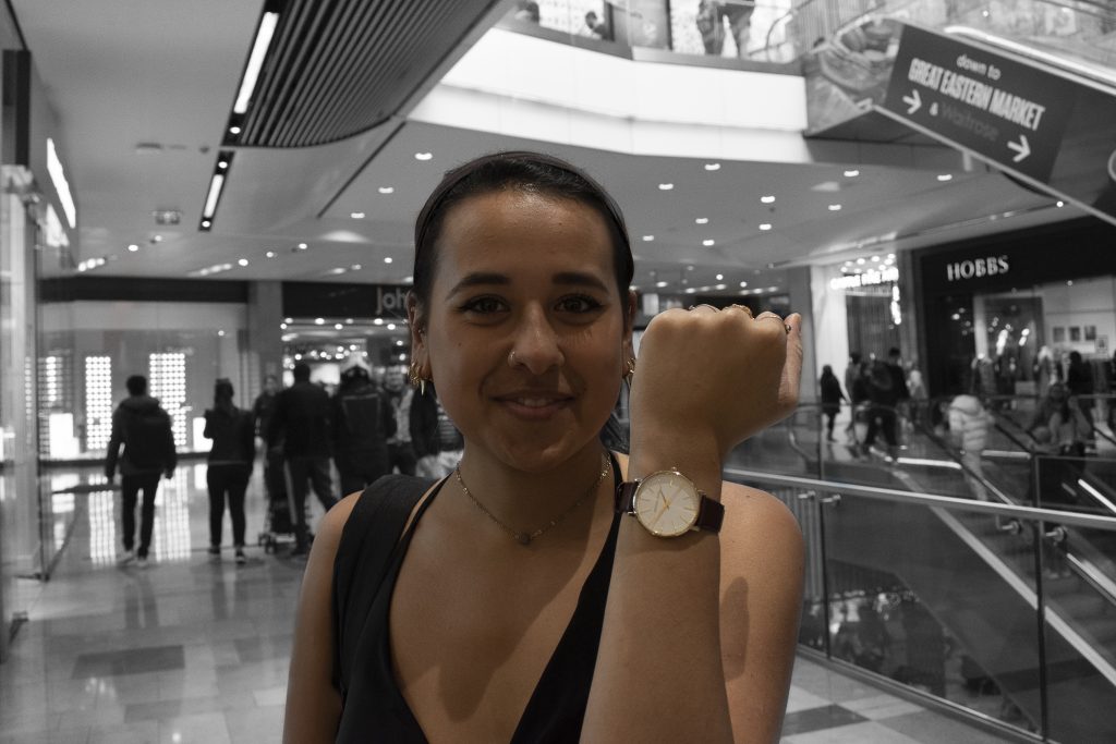 I had the pleasure to meet Katie at the Westfield mall on a Sunday Afternoon. She was rushing into the stores aiming to find the best deals on Christmas gifts for her family. I asked her about her watch, and she friendly replied that the watch she was wearing was once her mother’s watch that was given to her one day when she was rushing for a job interview and wanted to look professional. Her mother thinking of professionalism gave her the watch to complete her look. While she was telling me the story, I noticed that she couldn’t stop looking at the watch, almost as if she was reading the story from the book. As she kept talking about the watch her eyes lit up, she wasn’t just telling the story of that day, she was there, reliving it in full colors. What’s the power that such a small object holds? I asked myself.